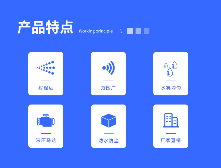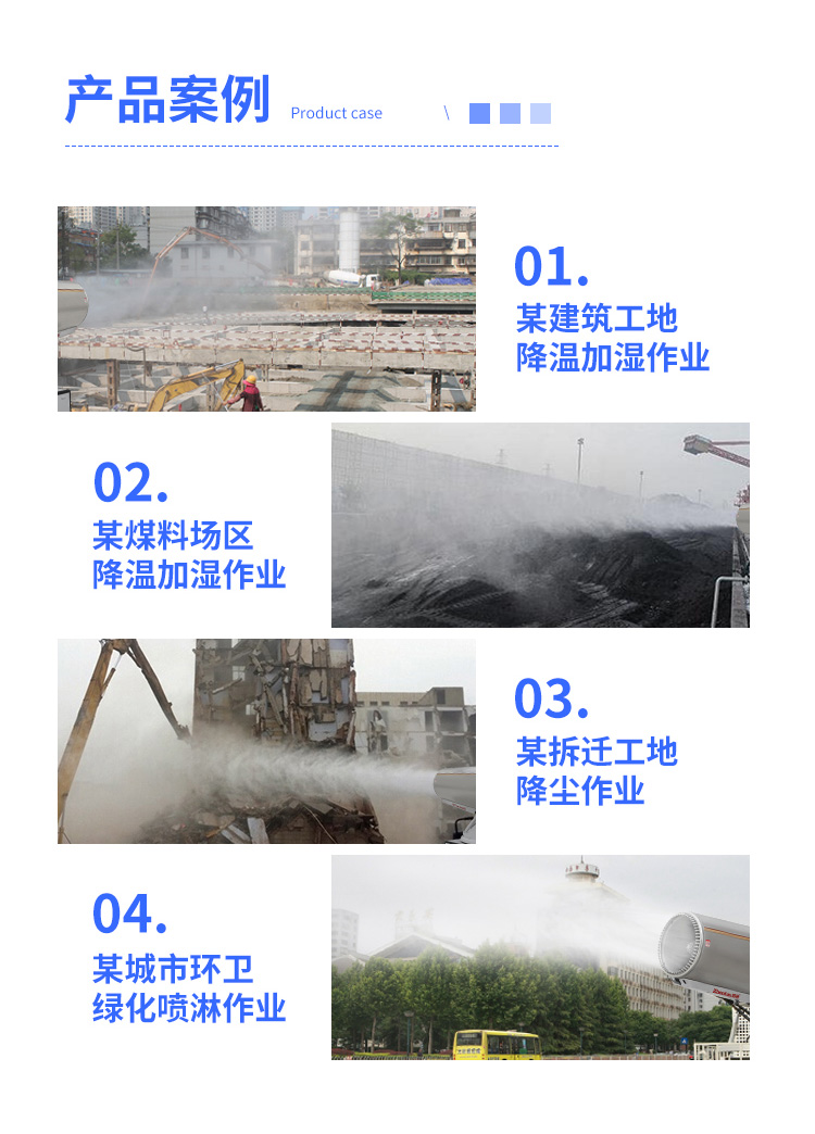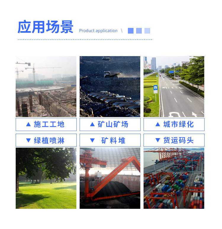 主要用途:用于煤矿场、城市拆迁工地、冶金钢铁企业、采矿区域、煤化工企业、水泥厂、火力发电厂、物料和矿产品露天堆放厂、混凝土处理厂、垃圾堆放场、垃圾焚烧厂、沙厂、干式物料仓库、露天爆破、重度粉尘区域。