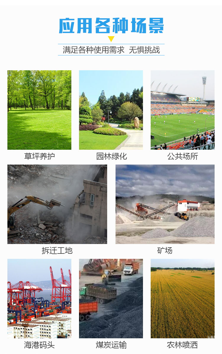 主要用途:城市拆迁工地、冶金钢铁企业、采矿区域、煤化工企业、水泥厂、火力发电厂、建筑工地、物料和矿产品露天堆放厂、混凝土处理厂、垃圾堆放场、垃圾焚烧厂、沙厂、干式物料仓库、露天爆破、重度粉尘区域。