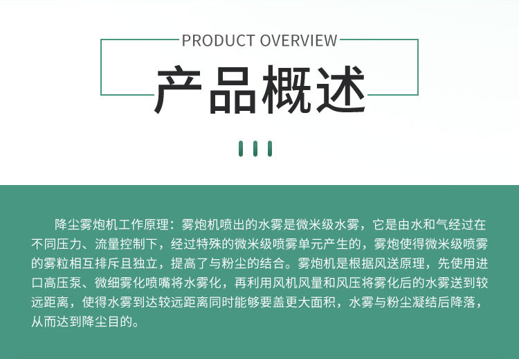 产品特点:固定式全自动雾炮机采用箱体式结构,安装方便;除尘效果好,覆盖范围广,工作效率高。