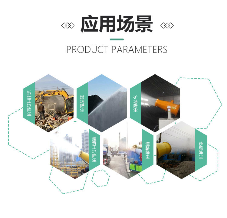 主要用途:建筑工地 煤场,矿场、料场、码头工业除尘,农业,园林绿化等飞机场、高速公路、车站、码头、公共场所、运动场地、炎热场地等降尘保湿降温消毒。
