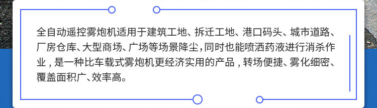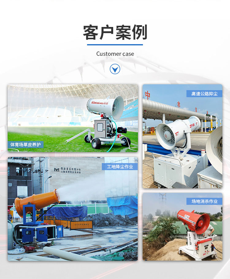 主要用途:建筑工地、冶金钢铁企业、采矿区域、煤化工企业、水泥厂、火力发电厂、建筑工地、物料和矿产品露天堆放厂、混凝土处理厂、垃圾堆放场、垃圾焚烧厂、沙厂、干式物料仓库、露天爆破、重度粉尘区域。