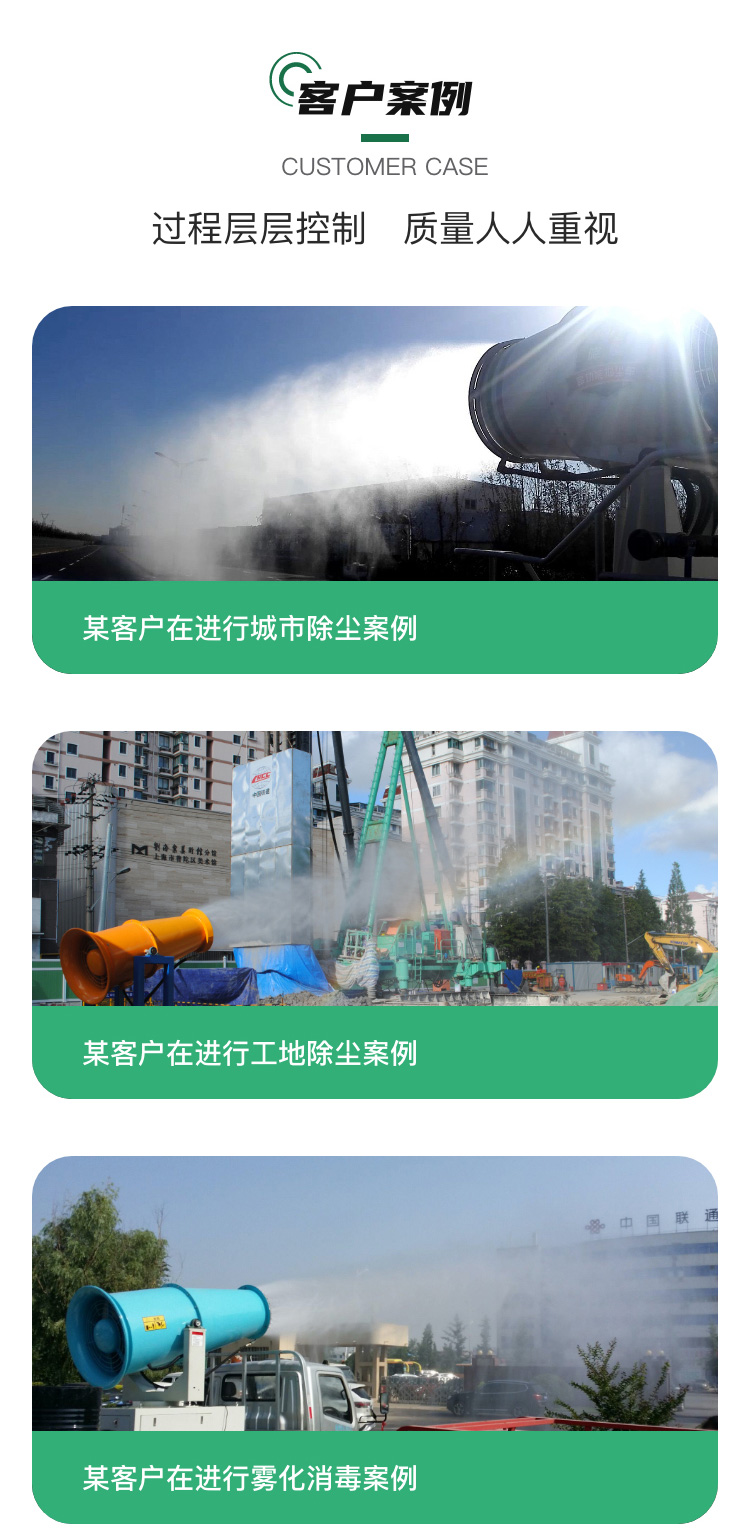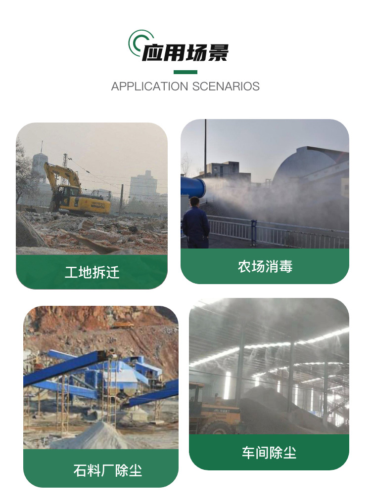 主要用途:建筑工地、冶金钢铁企业、采矿区域、煤化工企业、水泥厂、火力发电厂、建筑工地、物料和矿产品露天堆放厂、混凝土处理厂、垃圾堆放场、垃圾焚烧厂、沙厂、干式物料仓库、露天爆破、重度粉尘区域。