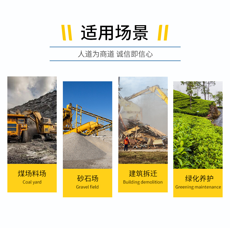 主要用途:用于煤矿场、城市拆迁工地、冶金钢铁企业、采矿区域、煤化工企业、水泥厂、火力发电厂、物料和矿产品露天堆放厂、混凝土处理厂、垃圾堆放场、垃圾焚烧厂、沙厂、干式物料仓库、露天爆破、重度粉尘区域。
