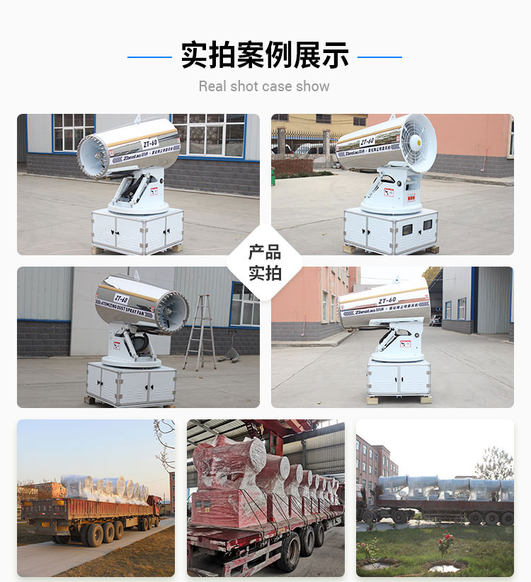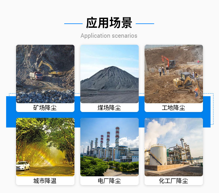 主要用途:用于城市拆迁工地、冶金钢铁企业、采矿区域、煤化工企业、水泥厂、火力发电厂、建筑工地、物料和矿产品露天堆放厂、混凝土处理厂、垃圾堆放场、垃圾焚烧厂、沙厂、干式物料仓库、露天爆破、重度粉尘区域。