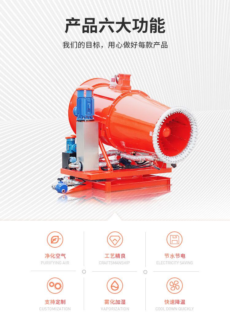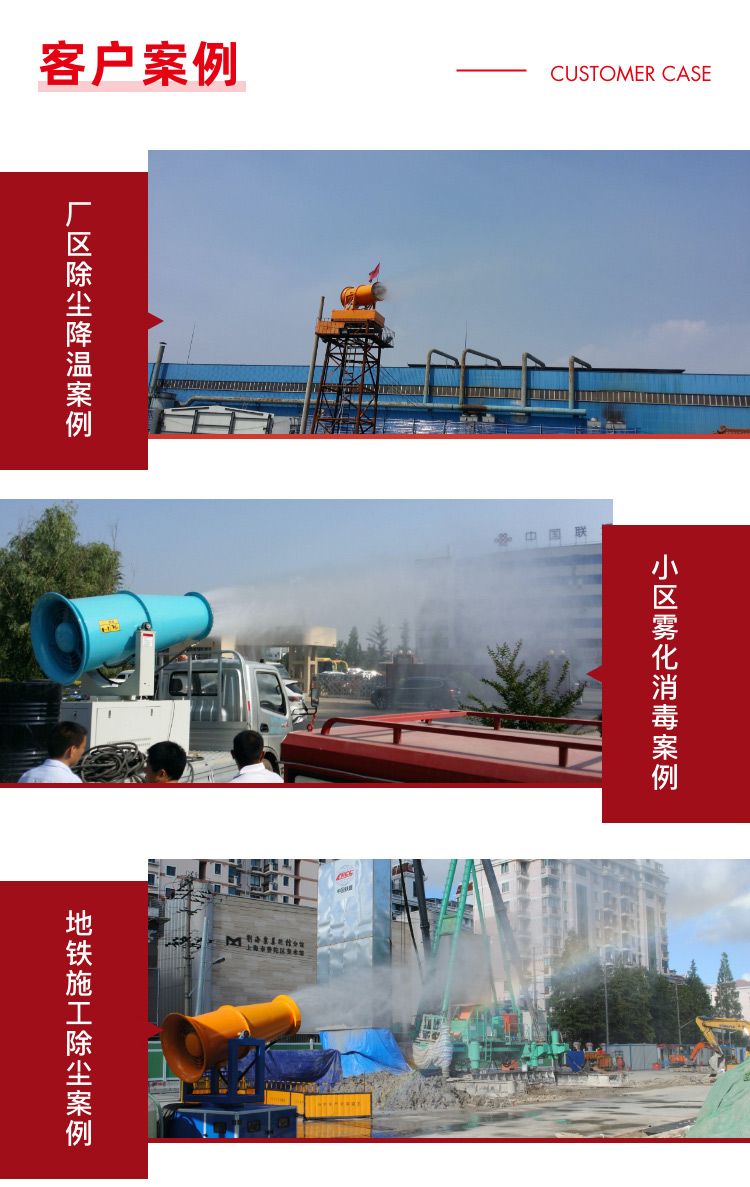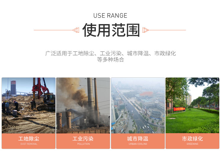 主要用途:用于煤矿场、城市拆迁工地、冶金钢铁企业、采矿区域、煤化工企业、水泥厂、火力发电厂、物料和矿产品露天堆放厂、混凝土处理厂、垃圾堆放场、垃圾焚烧厂、沙厂、干式物料仓库、露天爆破、重度粉尘区域。