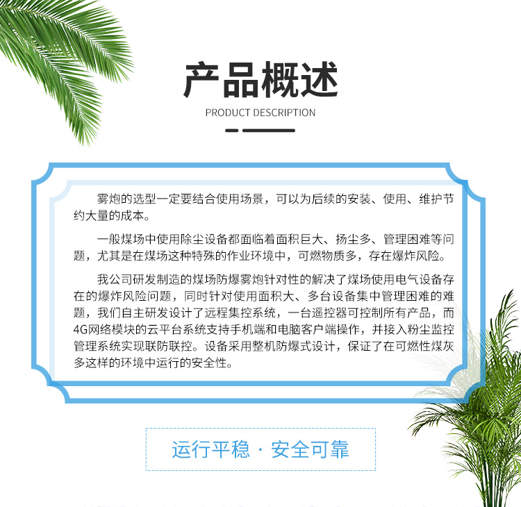 产品特点:100米煤场防爆雾炮机采用立式结构,工作稳定,并且全部都采用了软启动的装置,让设备在工作的时候能够正常稳定的发挥,采用1000米远程遥控,机身携带大功率信号接收器,可在更远的距离对机器设置起停,自动供水,自动喷雾,自动旋转,自动俯仰,也可采用定时喷雾,定点喷雾等更智能的操作模式。