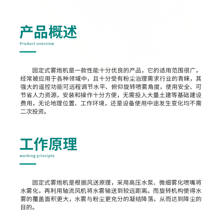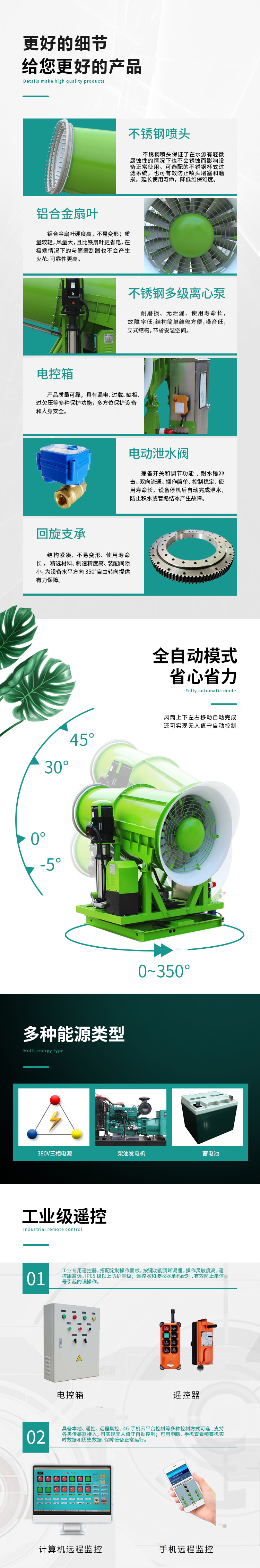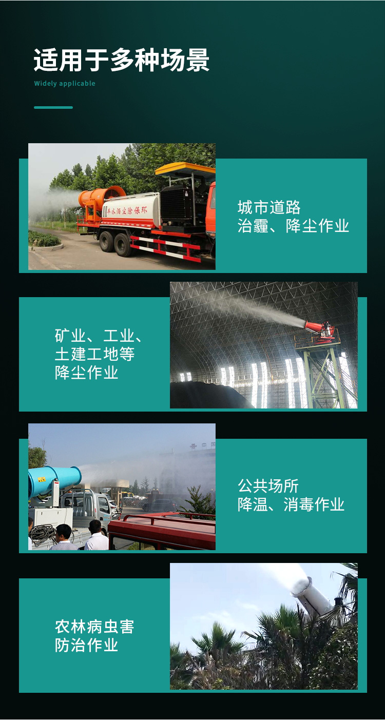 主要用途:用于煤矿场、城市拆迁工地、冶金钢铁企业、采矿区域、煤化工企业、水泥厂、火力发电厂、物料和矿产品露天堆放厂、混凝土处理厂、垃圾堆放场、垃圾焚烧厂、沙厂、干式物料仓库、露天爆破、重度粉尘区域。