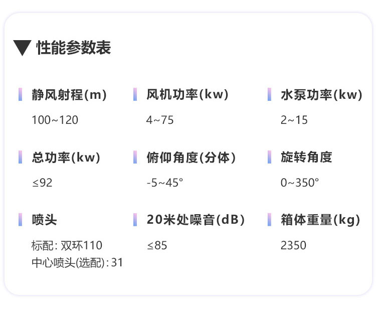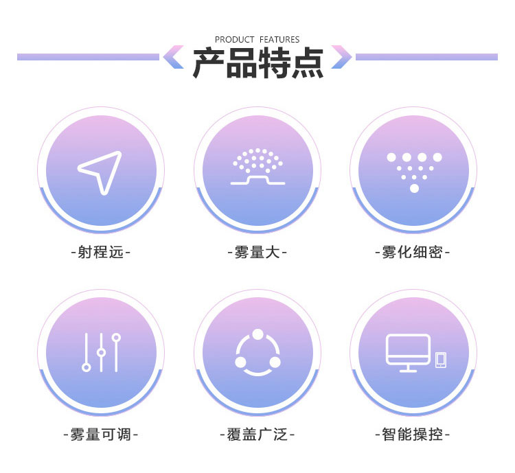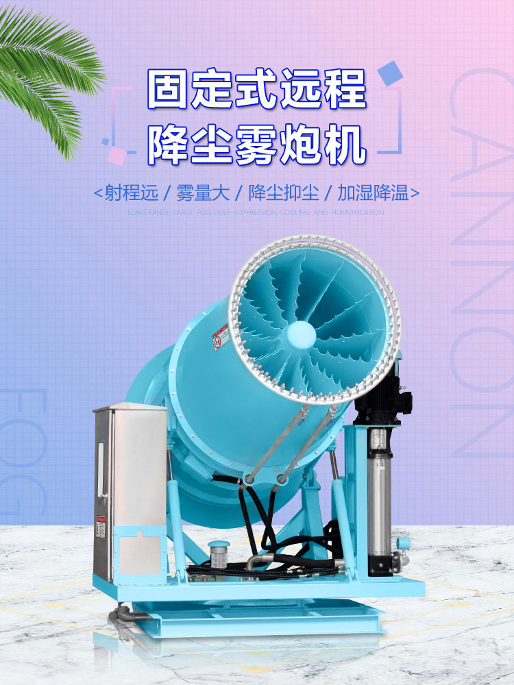产品特点:120米固定式远程雾炮机射程远、覆盖范围广、工作效率高、可以实现精量喷雾;配套动力灵活、智能操控、防冻防堵。