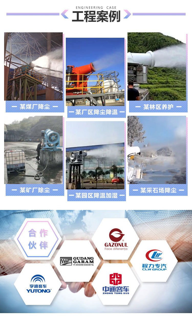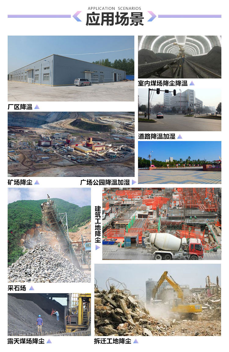 主要用途:用于煤矿场、城市拆迁工地、冶金钢铁企业、采矿区域、煤化工企业、水泥厂、火力发电厂、物料和矿产品露天堆放厂、混凝土处理厂、垃圾堆放场、垃圾焚烧厂、沙厂、干式物料仓库、露天爆破、重度粉尘区域。