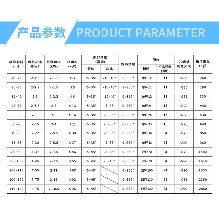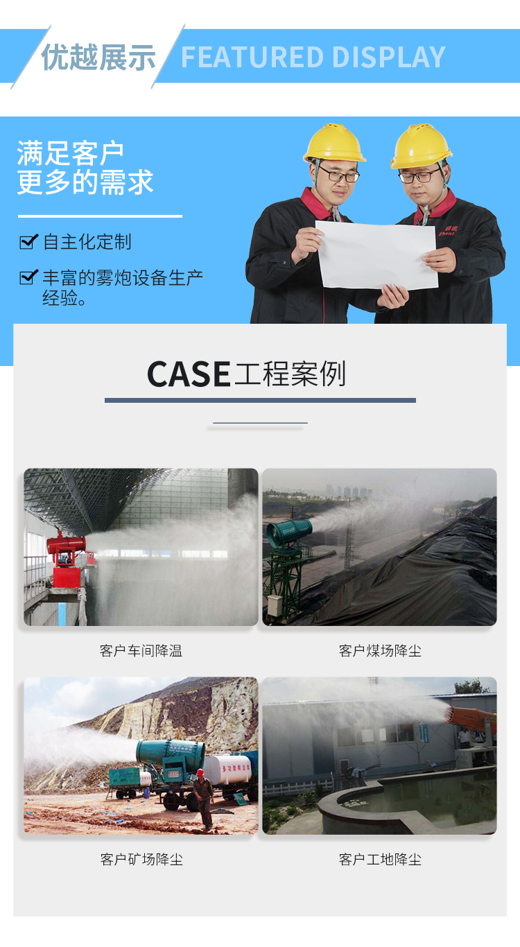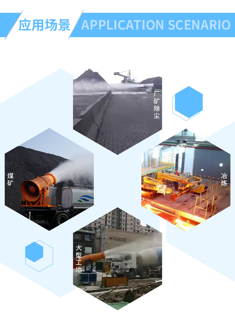 主要用途:适用于城市拆迁工地、冶金钢铁企业、采矿区域、煤化工企业、水泥厂、火力发电厂、建筑工地、物料和矿产品露天堆放厂、混凝土处理厂、垃圾堆放场、垃圾焚烧厂、沙厂、干式物料仓库、露天爆破、重度粉尘区域。