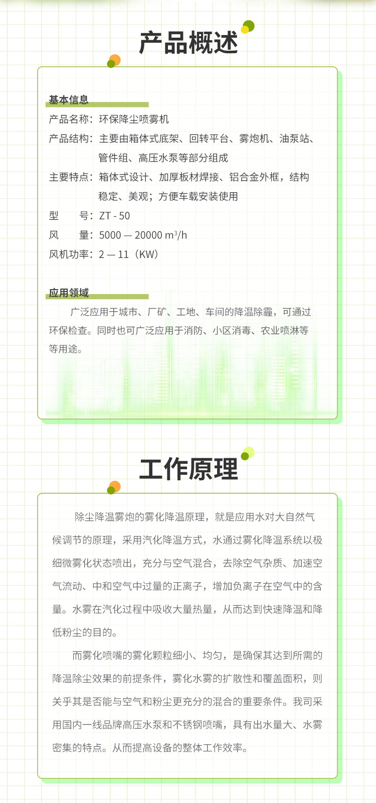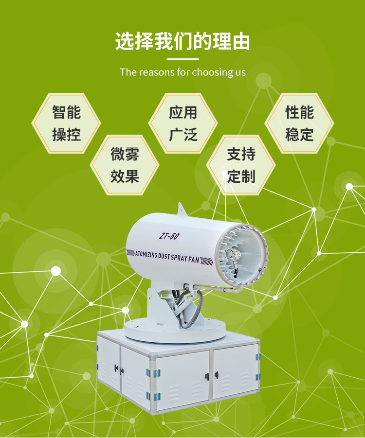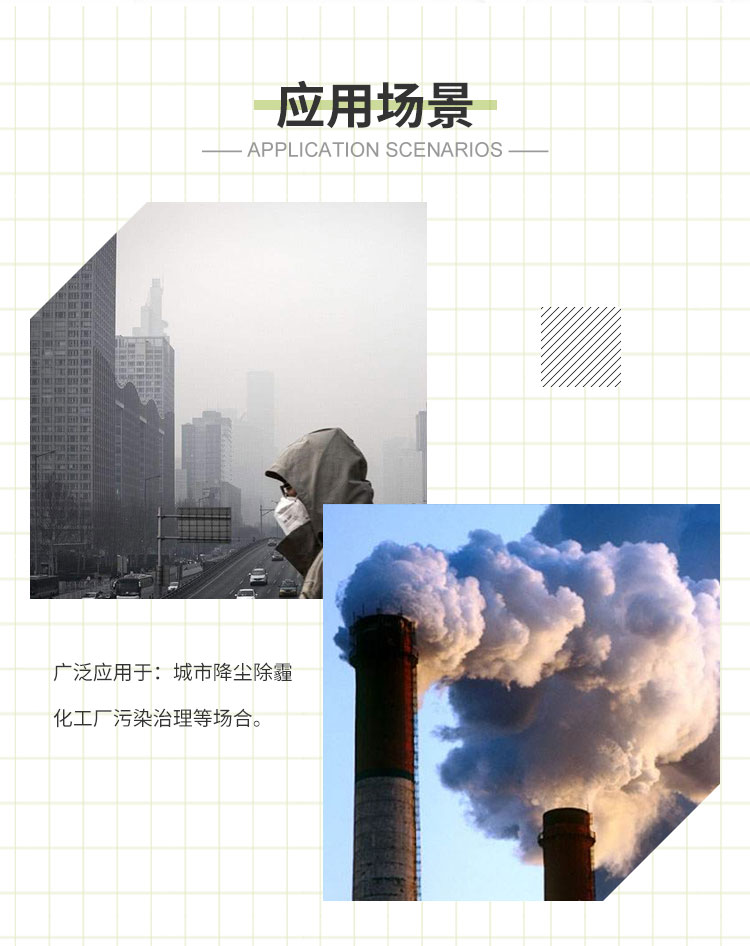 主要用途:适用于城市拆迁工地、冶金钢铁企业、采矿区域、煤化工企业、水泥厂、火力发电厂、建筑工地、物料和矿产品露天堆放厂、混凝土处理厂、垃圾堆放场、垃圾焚烧厂、沙厂、干式物料仓库、露天爆破、重度粉尘区域。