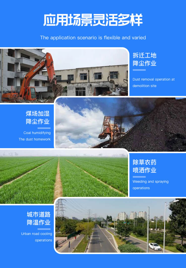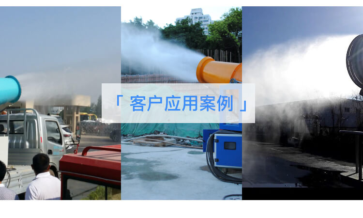 主要用途:建筑工地、冶金钢铁企业、采矿区域、煤化工企业、水泥厂、火力发电厂、建筑工地、物料和矿产品露天堆放厂、混凝土处理厂、垃圾堆放场、垃圾焚烧厂、沙厂、干式物料仓库、露天爆破、重度粉尘区域。