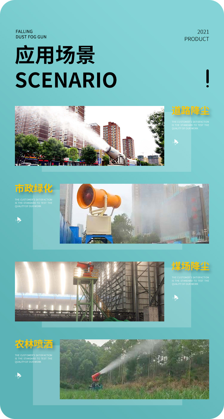 主要用途:用于煤矿场、城市拆迁工地、冶金钢铁企业、采矿区域、煤化工企业、水泥厂、火力发电厂、物料和矿产品露天堆放厂、混凝土处理厂、垃圾堆放场、垃圾焚烧厂、沙厂、干式物料仓库、露天爆破、重度粉尘区域。