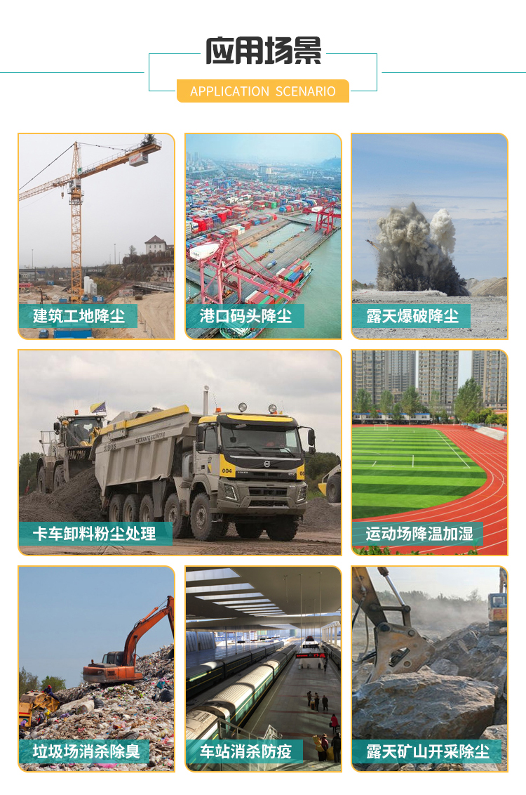 主要用途:用于煤矿场、城市拆迁工地、冶金钢铁企业、采矿区域、煤化工企业、水泥厂、火力发电厂、物料和矿产品露天堆放厂、混凝土处理厂、垃圾堆放场、垃圾焚烧厂、沙厂、干式物料仓库、露天爆破、重度粉尘区域。