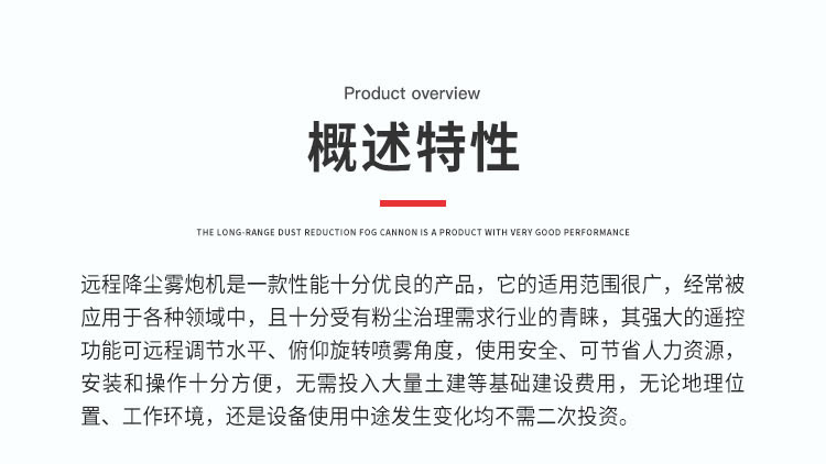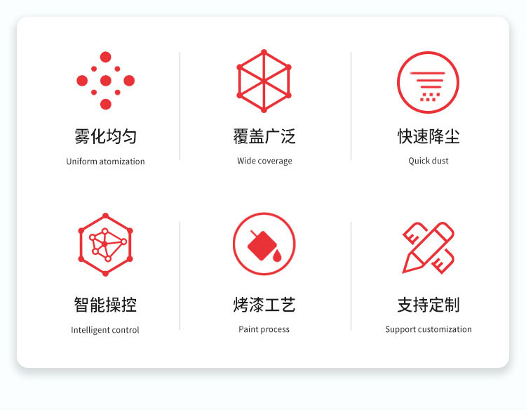 产品特点:80米远程降尘雾炮机雾化均匀、覆盖范围广、雾化颗粒细,智能操控模式、运行平稳使用安全可靠。