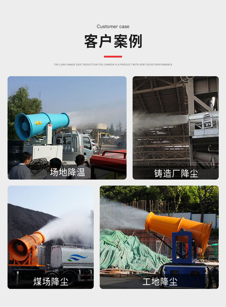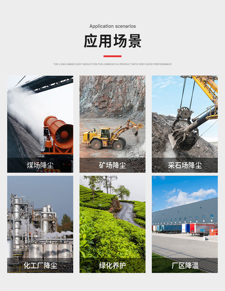 主要用途:用于煤矿场、城市拆迁工地、冶金钢铁企业、采矿区域、煤化工企业、水泥厂、火力发电厂、物料和矿产品露天堆放厂、混凝土处理厂、垃圾堆放场、垃圾焚烧厂、沙厂、干式物料仓库、露天爆破、重度粉尘区域。
