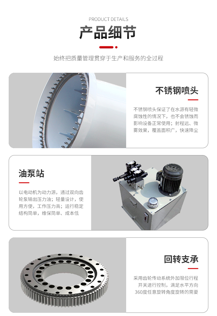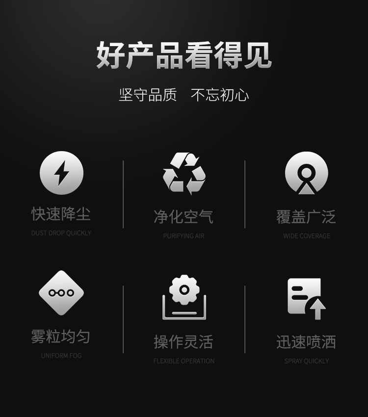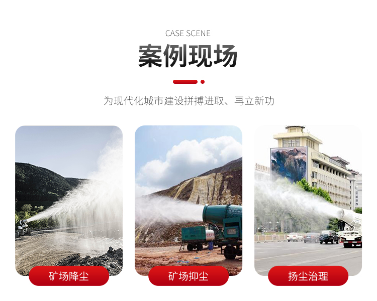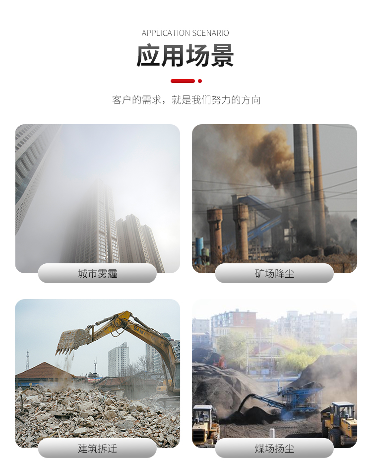 主要用途:用于城市拆迁工地、冶金钢铁企业、采矿区域、煤化工企业、水泥厂、火力发电厂、建筑工地、物料和矿产品露天堆放厂、混凝土处理厂、垃圾堆放场、垃圾焚烧厂、沙厂、干式物料仓库、露天爆破、重度粉尘区域。