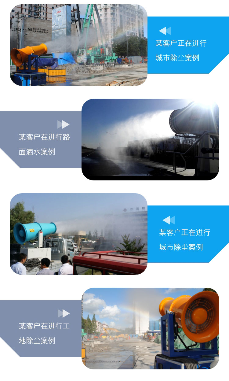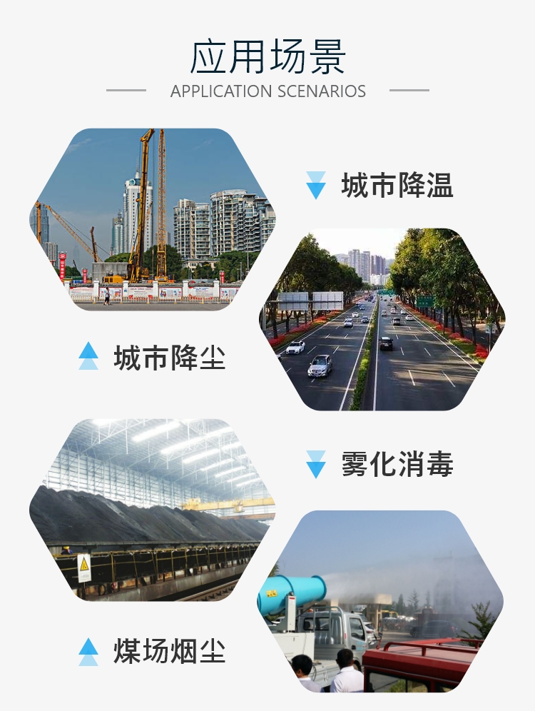 主要用途:用于煤矿场、城市拆迁工地、冶金钢铁企业、采矿区域、煤化工企业、水泥厂、火力发电厂、物料和矿产品露天堆放厂、混凝土处理厂、垃圾堆放场、垃圾焚烧厂、沙厂、干式物料仓库、露天爆破、重度粉尘区域。