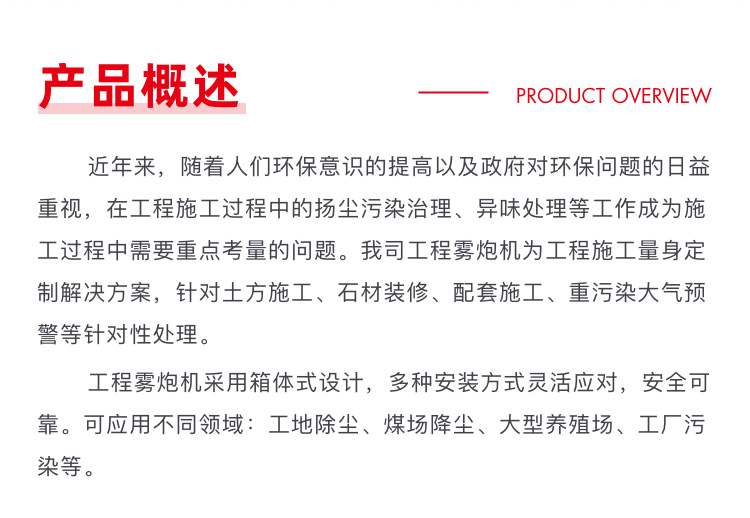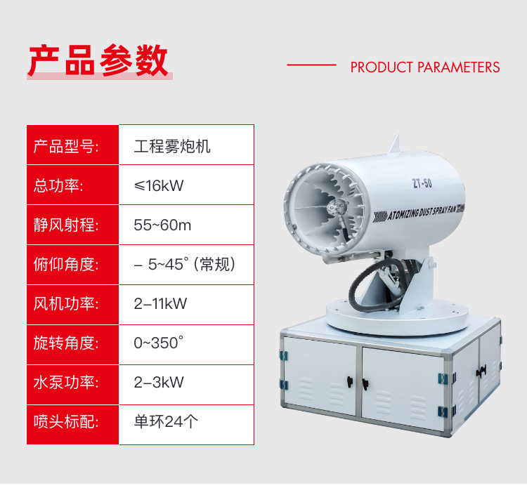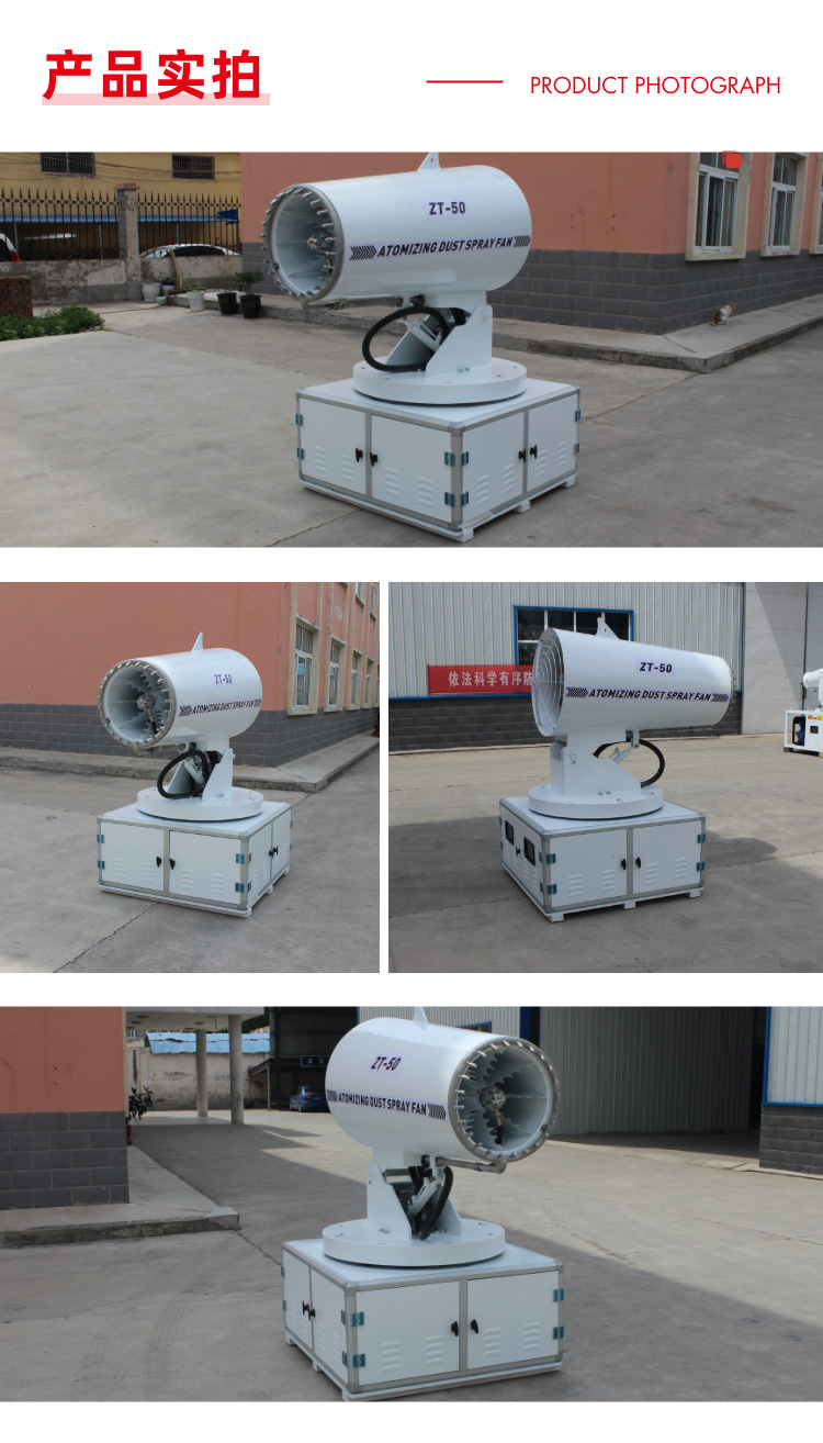 产品特点:工程雾炮机可移动、可装车、可固定、适应性强;射程远、覆盖面积大,加速尘埃降沉,抑制尘埃扩散,结构可靠、运行稳定、作业效率高,??乜刂苹蛉远诵?灵活切换,启动便捷。