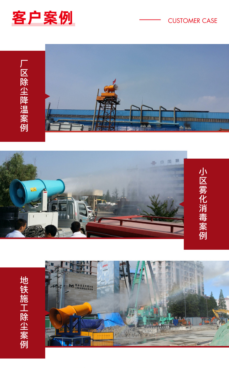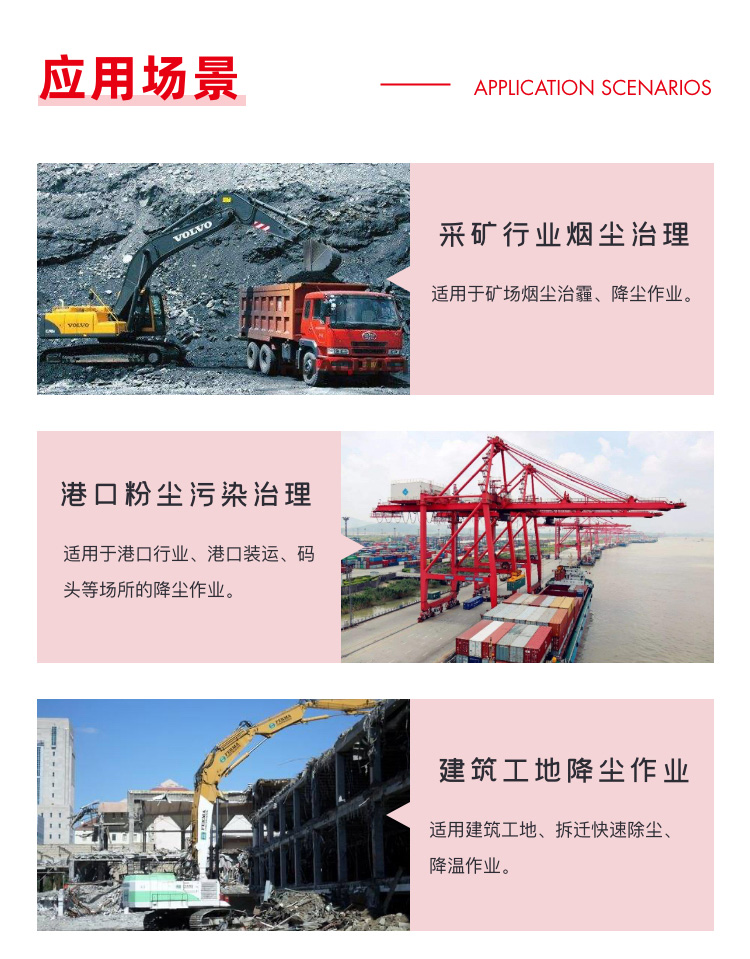 主要用途:适用于城市拆迁工地、冶金钢铁企业、采矿区域、煤化工企业、水泥厂、火力发电厂、建筑工地、物料和矿产品露天堆放厂、混凝土处理厂、垃圾堆放场、垃圾焚烧厂、沙厂、干式物料仓库、露天爆破、重度粉尘区域。