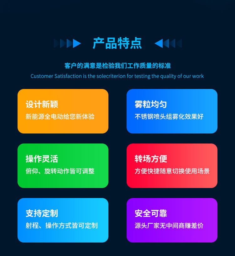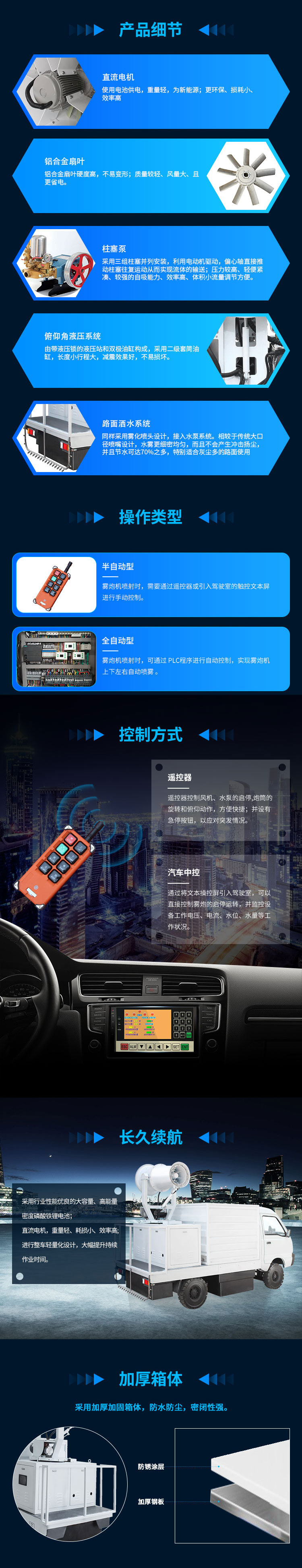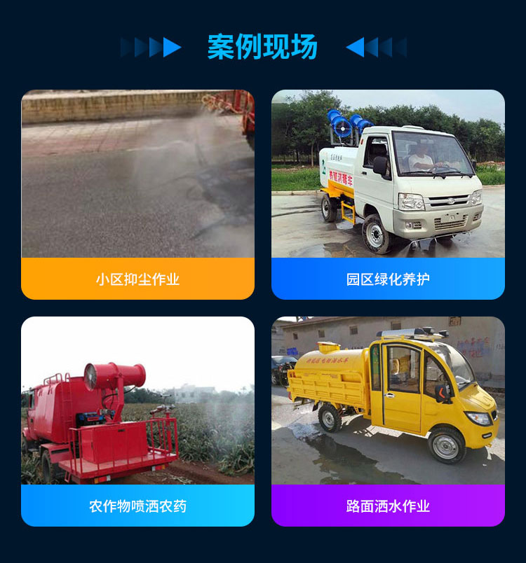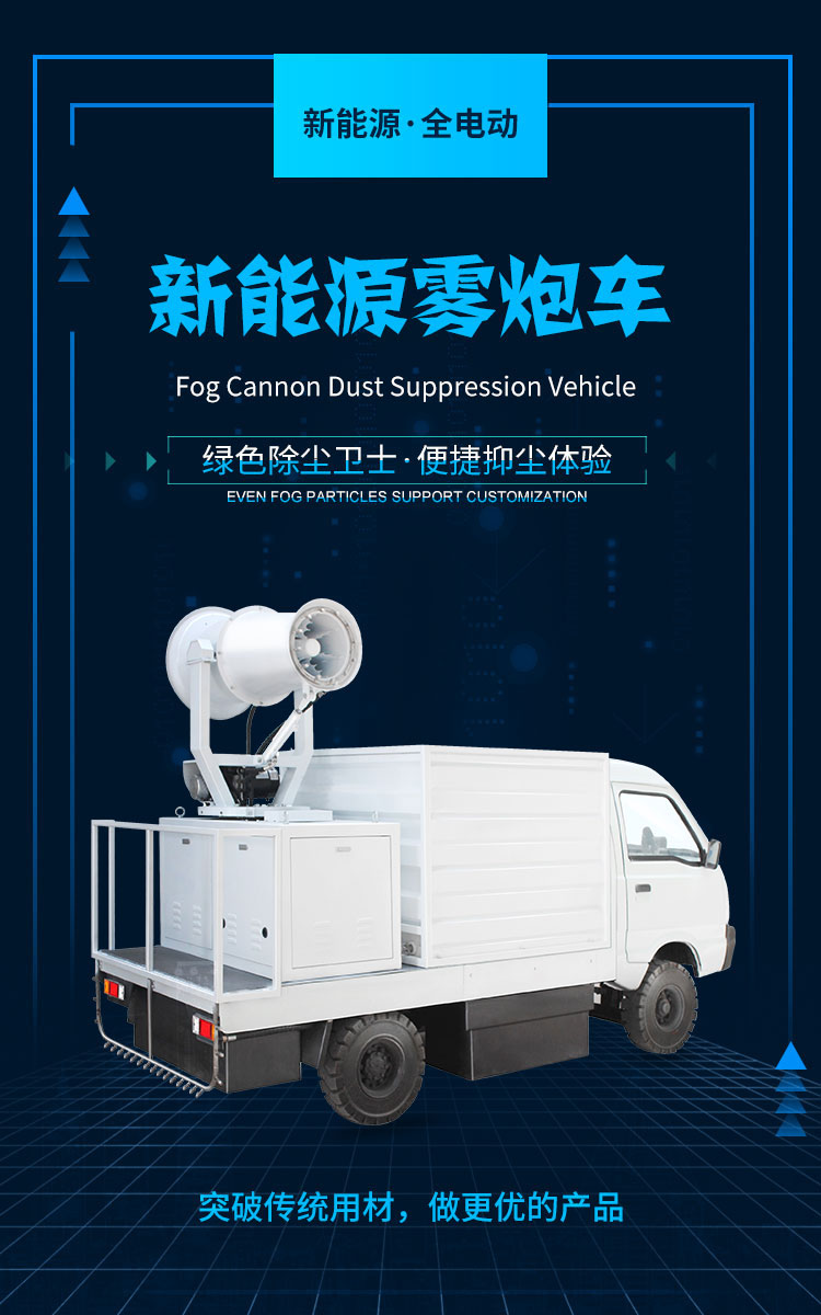 产品特点:新能源雾炮车是纯电动抑尘车,电机采用直流电机驱动、直流蓄电池供电的方式,使用方便、充电便捷、不用添加燃料、绿色减排;在保证喷雾效果的同时,用水量较少,也更节约电力。