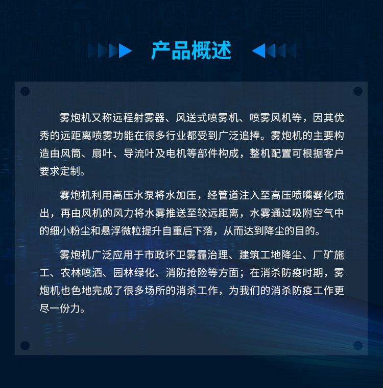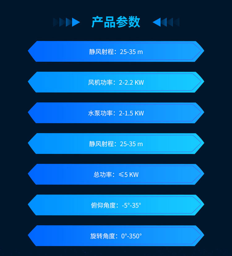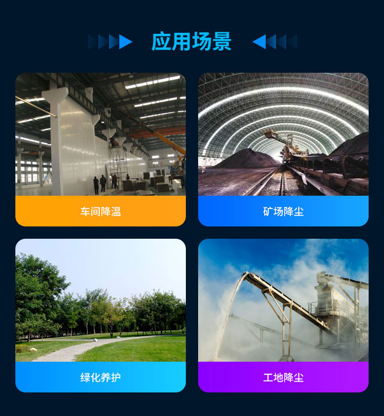 主要用途:用于煤矿场、城市拆迁工地、冶金钢铁企业、采矿区域、煤化工企业、水泥厂、火力发电厂、物料和矿产品露天堆放厂、混凝土处理厂、垃圾堆放场、垃圾焚烧厂、沙厂、干式物料仓库、露天爆破、重度粉尘区域。