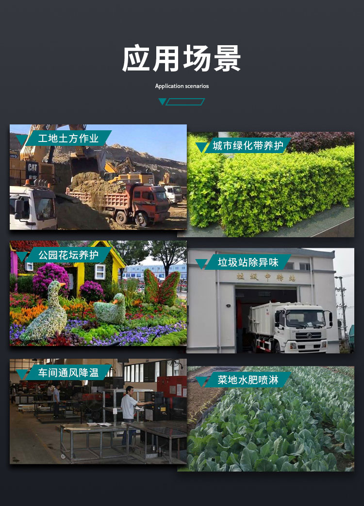 车间通风降温、植被养护浇水加湿、垃圾站除异味、植物作物水肥药物喷淋等。