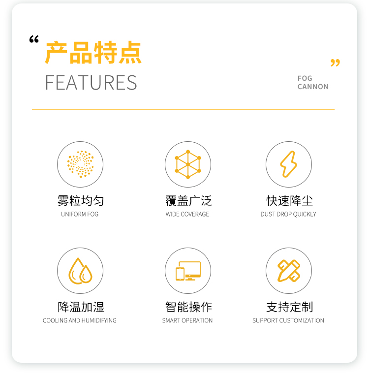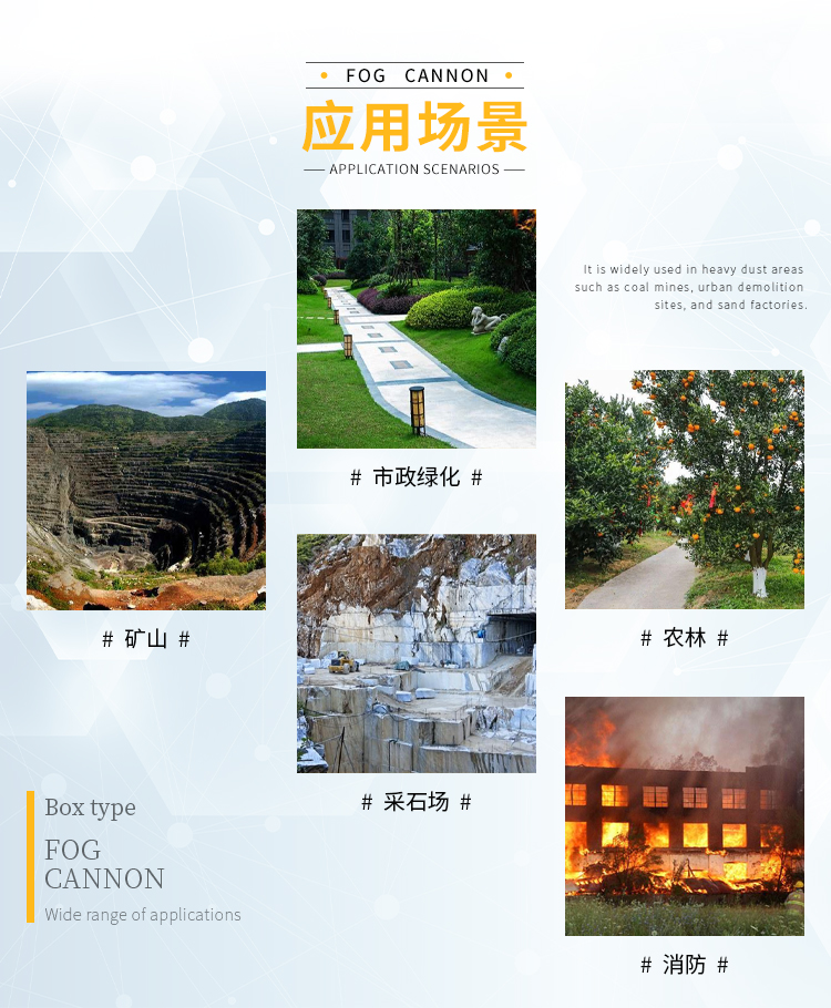 主要用途:用于煤矿场、城市拆迁工地、冶金钢铁企业、采矿区域、煤化工企业、水泥厂、火力发电厂、物料和矿产品露天堆放厂、混凝土处理厂、垃圾堆放场、垃圾焚烧厂、沙厂、干式物料仓库、露天爆破、重度粉尘区域。