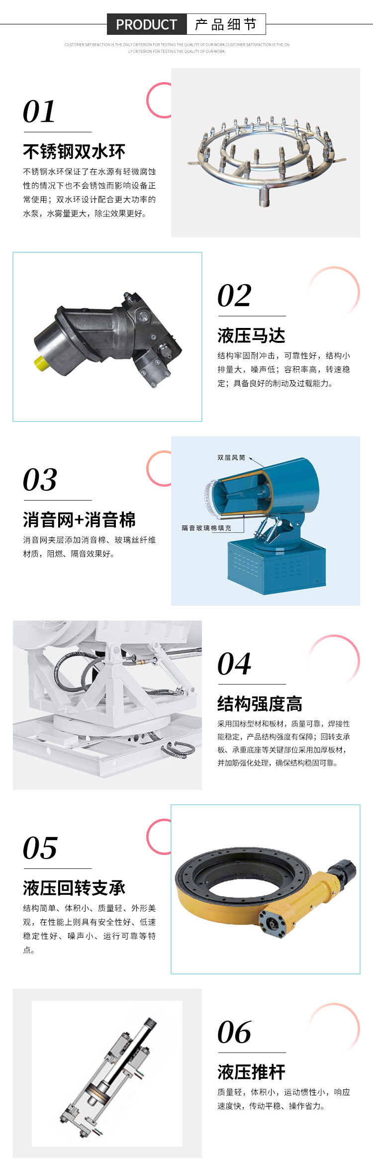 产品特点:80米液压雾炮机的炮筒筒身采用双层设计,内覆微冲孔网并有玻璃丝纤维棉夹层,可以起到良好的被动消声效果。