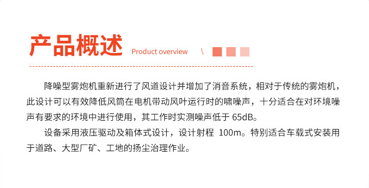 产品特点:降噪型液压雾炮机增加了消音系统,相对于传统的雾炮机,此设计可以有效降低风筒在电机带动风叶运行时的啸噪声,十分适合在对环境噪声有要求的环境中进行使用,其工作时实测噪声低于65dB。