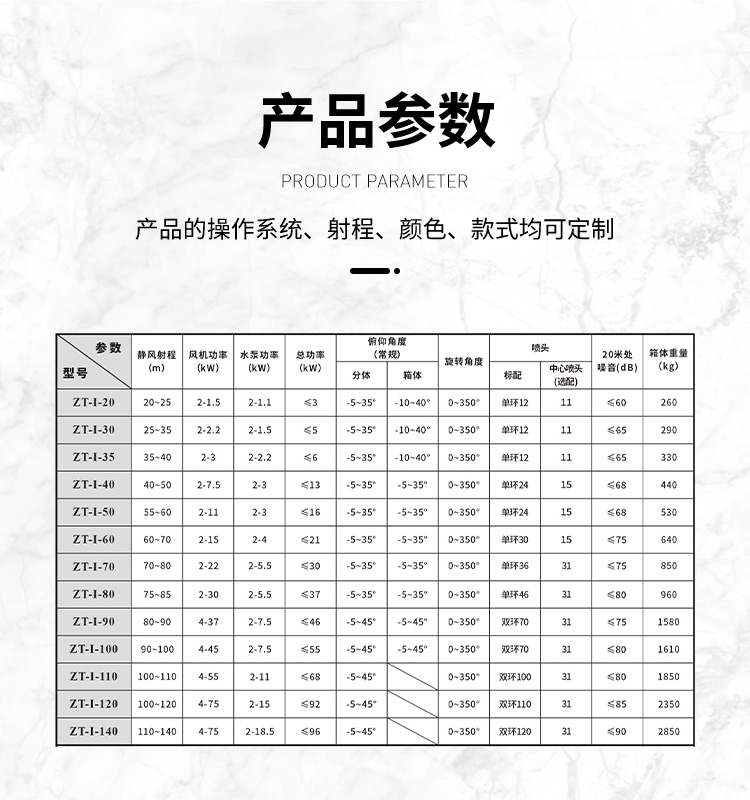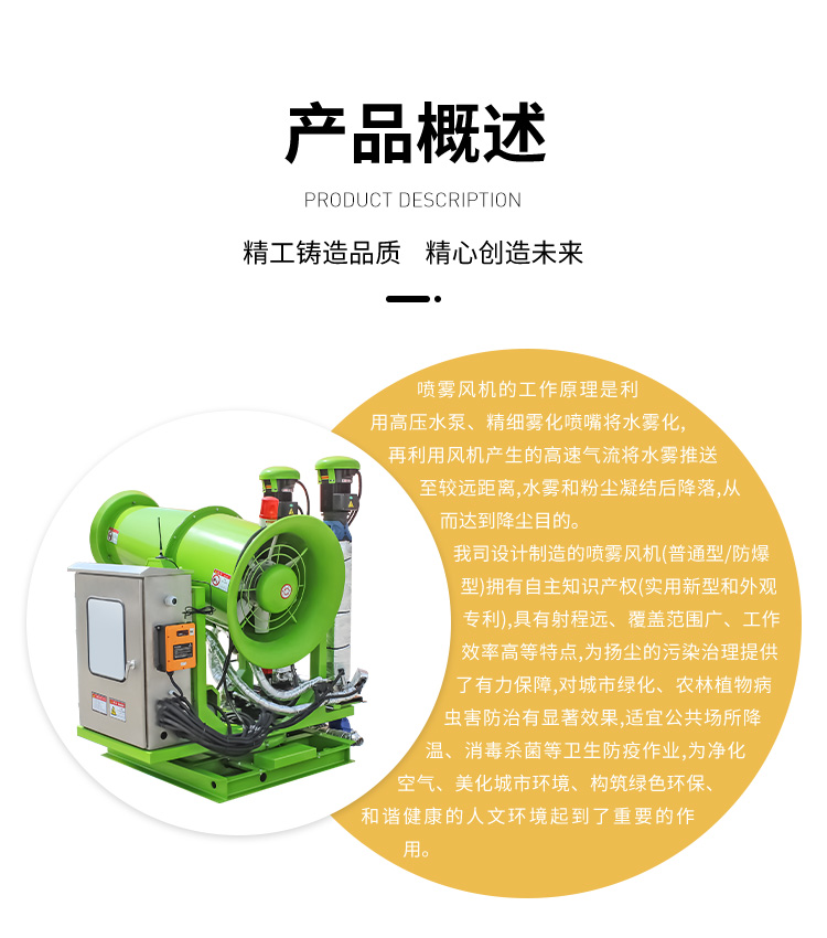产品特点:固定式双泵降尘雾炮机采用立式结构,工作稳定,自动供水,自动喷雾,自动旋转,自动俯仰,也可采用定时喷雾,定点喷雾等更智能的操作模式。