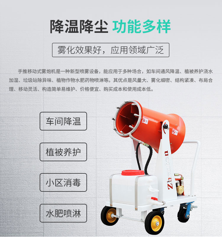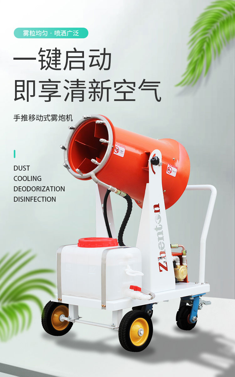 工地小型手推移动式雾炮机降尘速度快、风量大、机结构紧凑、布局合理、移动灵活、构造简单易维护。