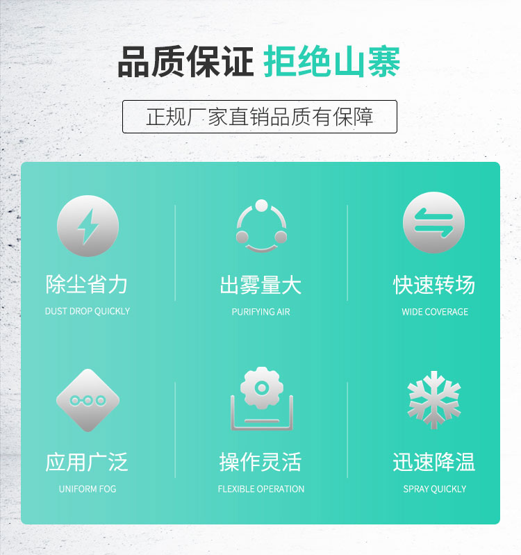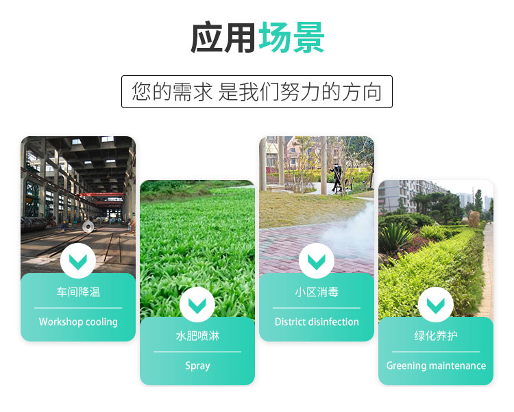 车间通风降温、植被养护浇水加湿、垃圾站除异味、植物作物水肥药物喷淋等。