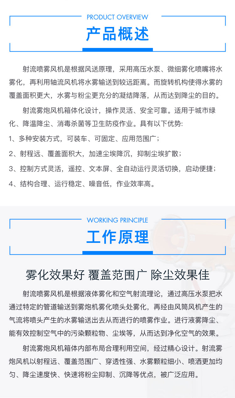 产品特点:工地射流雾炮风机射程远、覆盖面积大,加速尘埃降沉,抑制尘埃扩散;控制方式灵活,启动便捷;结构合理、运行稳定、噪音低,作业效率高。