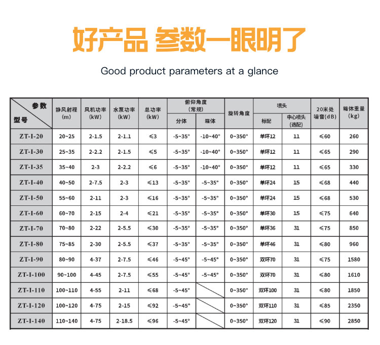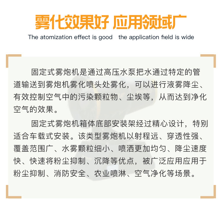 产品特点:100米固定式雾炮机射程远、覆盖范围广、工作效率高、可以实现精量喷雾;配套动力灵活,使用安全可靠。