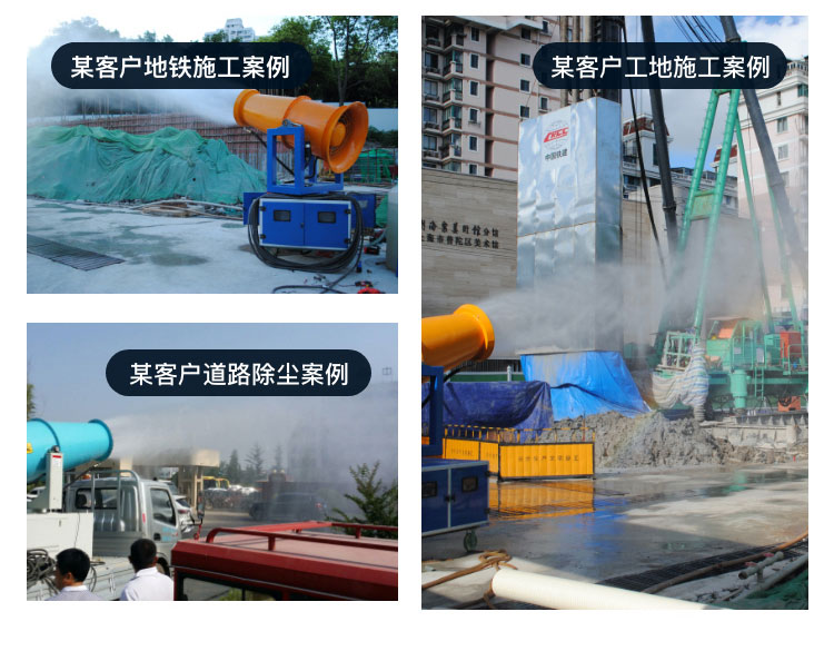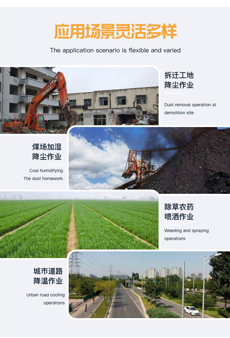 主要用途:用于煤矿场、城市拆迁工地、冶金钢铁企业、采矿区域、煤化工企业、水泥厂、火力发电厂、物料和矿产品露天堆放厂、混凝土处理厂、垃圾堆放场、垃圾焚烧厂、沙厂、干式物料仓库、露天爆破、重度粉尘区域。