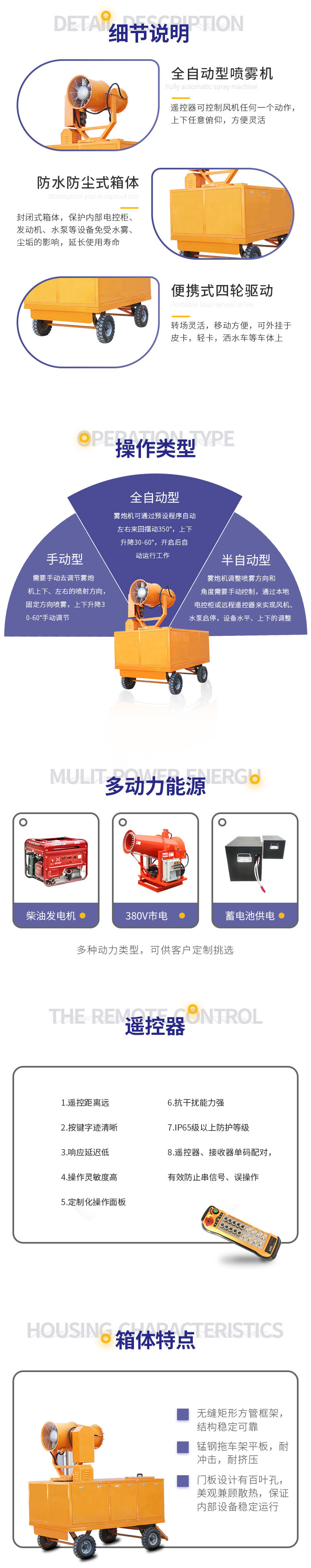 产品特点:农林拖车型雾炮机移动方便,内置水箱,??仄骺煽刂品缁魏我桓龆鳎赏夤矣谄た?,轻卡,洒水车等车体上。