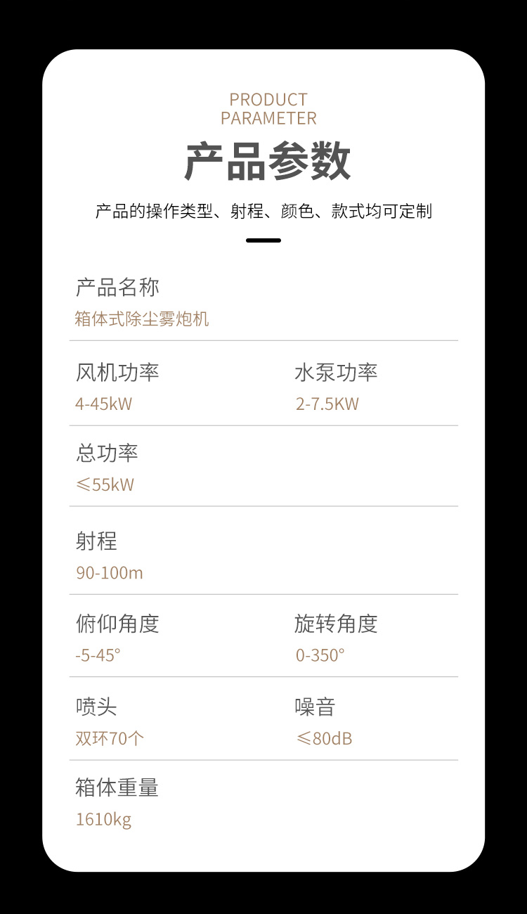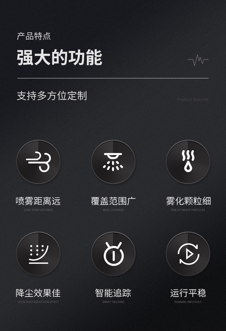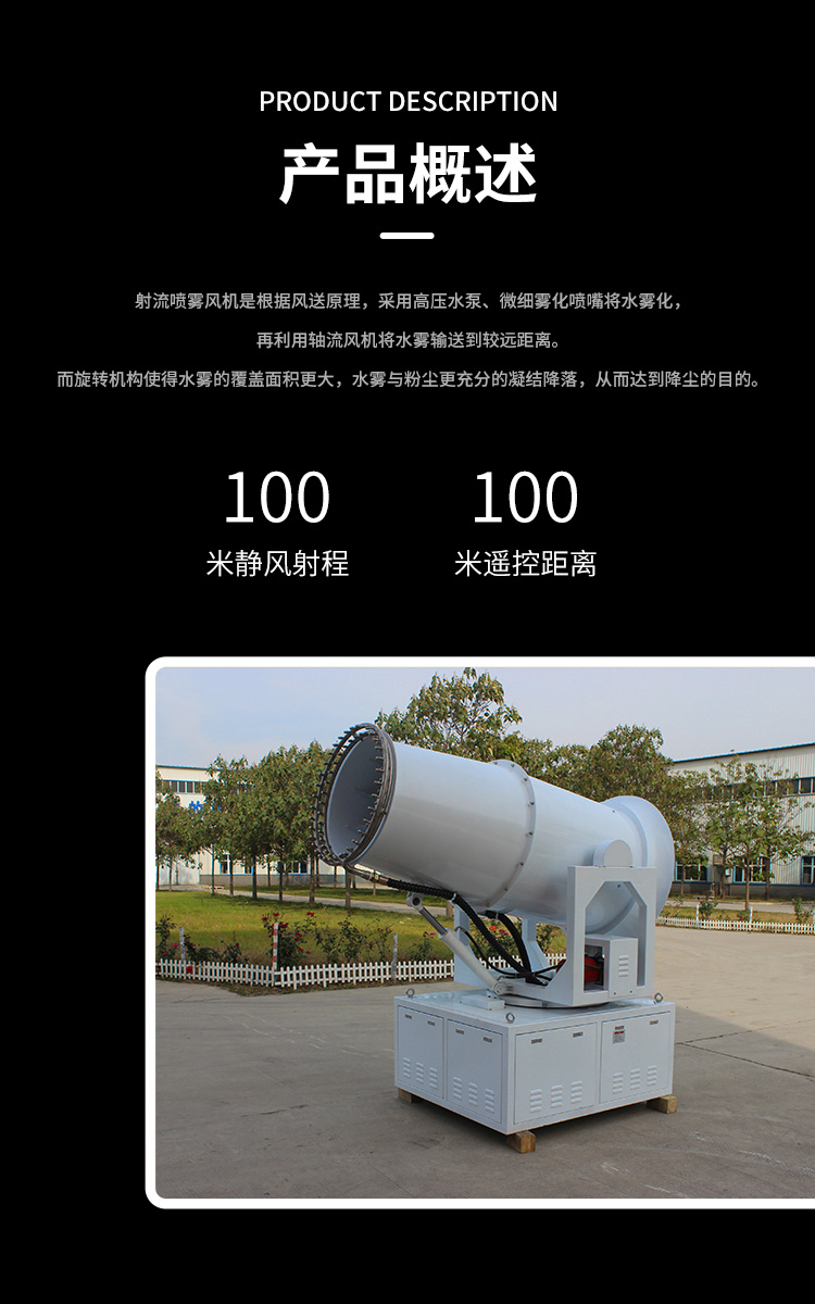 产品特点:100米双水箱雾炮机喷雾距离远、覆盖范围广、雾化颗粒细、降尘效果佳、运行平稳使用安全可靠。