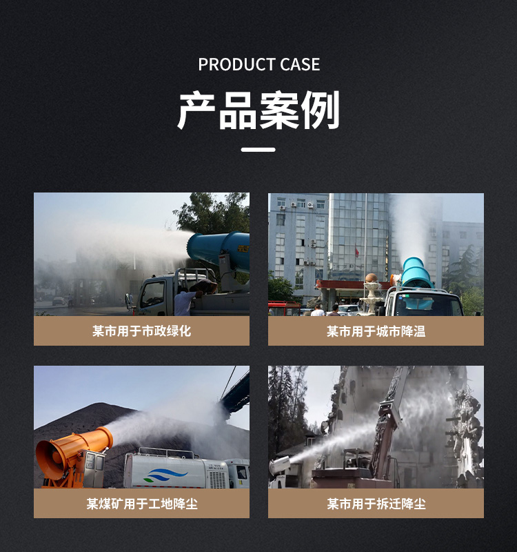主要用途:用于煤矿场、城市拆迁工地、冶金钢铁企业、采矿区域、煤化工企业、水泥厂、火力发电厂、物料和矿产品露天堆放厂、混凝土处理厂、垃圾堆放场、垃圾焚烧厂、沙厂、干式物料仓库、露天爆破、重度粉尘区域。