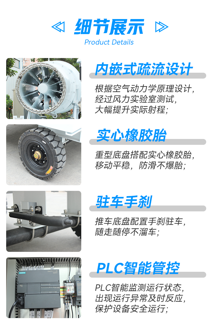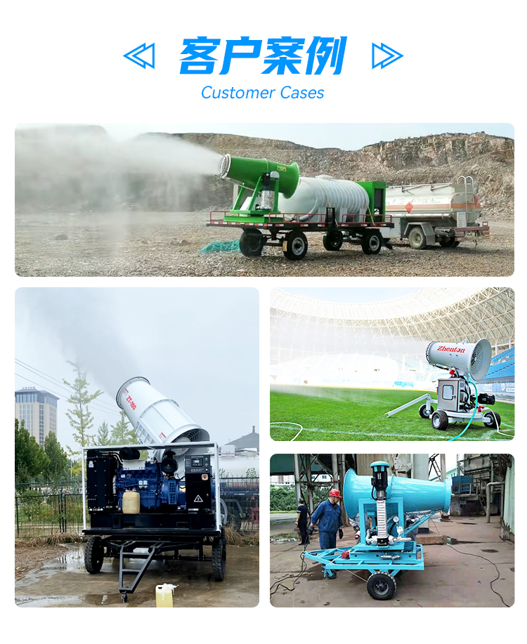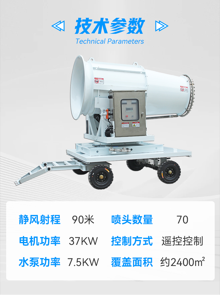 产品特点:90米拖车式雾炮机采用四轮牵引设计,移动性强、动力强、射程远、覆盖广泛、可实现精量喷雾;工作效能高、喷雾加湿更快,能迅速降温抑尘;配件驱动可灵活定制,操作便捷,灵活方便。