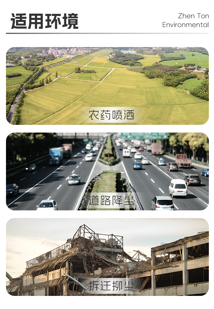 主要用途:适用于城市道路降尘、建筑工地、煤场、工业除尘、农业和园林绿化等粉尘大场所。