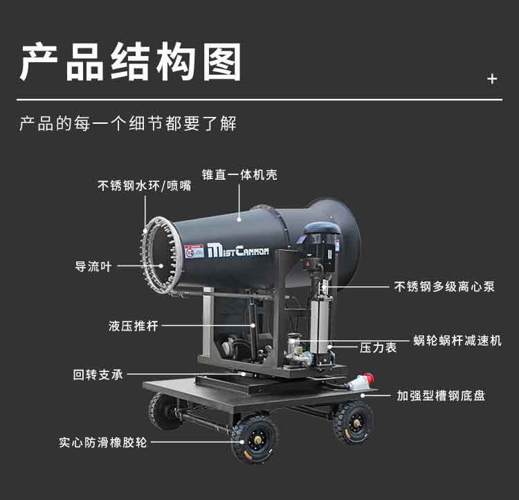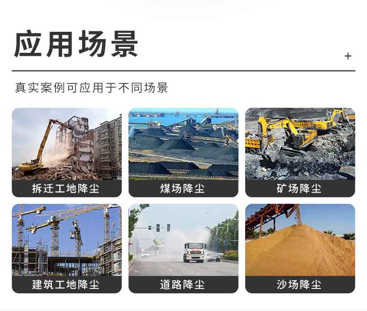 主要用途:冶金钢铁企业、采矿区域、煤化工企业、水泥厂、火力发电厂、城市拆迁工地、建筑工地、露天堆放厂、混凝土处理厂、垃圾堆放场、垃圾焚烧厂、城市道路降尘、喷雾打药等场景。