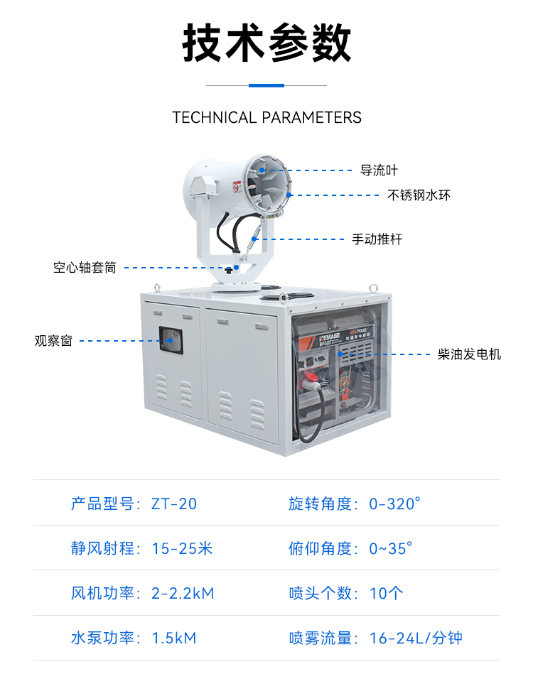 产品特点:这款ZT-20型车载式柴油发电雾炮机 ,其射程达20米,覆盖范围广。它喷雾速度快、效率高,能快速降低空气中的粉尘浓度。采用柴油发电机供电,灵活性强,不受场地限制。配备??睾褪侄刂撇僮?,可随意调节水平旋转喷雾角度,使用安全可靠。
