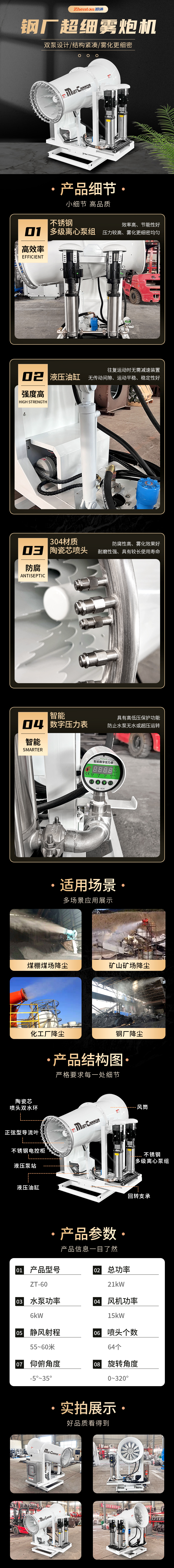 产品特点:这款ZT-60型钢厂超细雾炮机,实际射程在50-60米,双泵设计,结构紧凑,雾化更细密,是钢厂,煤场,水泥厂,电厂,煤棚等要求环保达标的场景必备喷雾降尘设备。用的是不锈钢多级离心泵组,效率高的同时也更节能,液压油缸,稳定性强。304陶瓷喷头,防腐性高,使用寿命更长。配备有智能数字压力表。具有高低压?;すδ?,防止水泵无水或超压运转。郑通雾炮机厂家生产,好质量看的到,15-150型,款式齐全,定制可选。