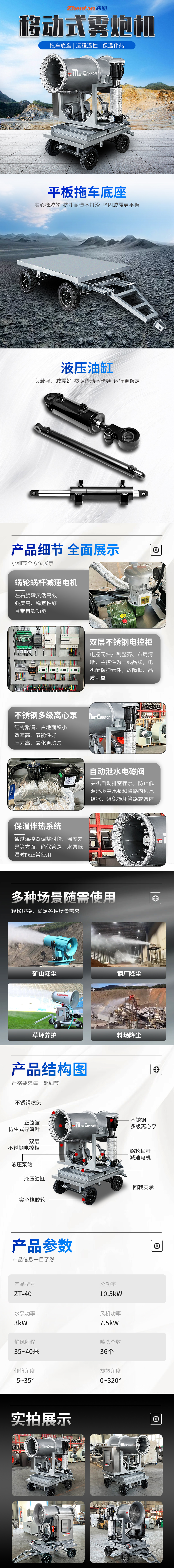 产品特点:这款ZT-40型拖车式移动雾炮机,拖车底盘设计,移动便携,喷雾范围可随意变换。由不锈钢喷头、不锈钢多级离心泵、正弦波仿生式导流叶、双层不锈钢电控柜、蜗轮蜗杆减速电机、液压泵站、液压油缸、回转支撑、实心橡胶轮等结构制造。有手动,自动,远程???,智能系统等操作方式,可适用于煤场,矿山,砂石料场,水泥厂,焦化厂,农药喷洒等场景的降温除尘,喷雾打药使用。15-150米射程,型号齐全,支持定制,有需要欢迎随时联系:徐经理18703685880/17303712093(微信同号)