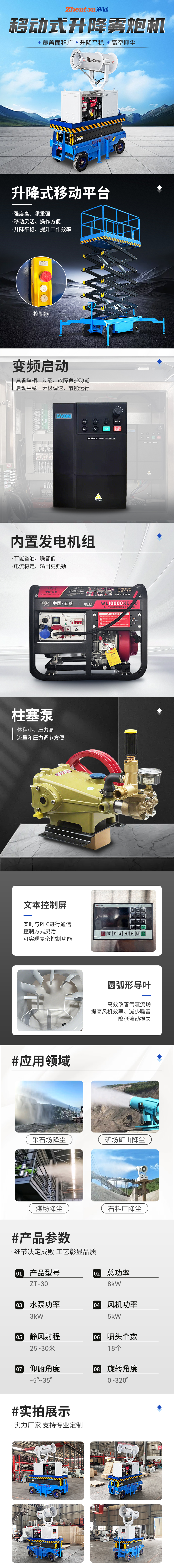 产品特点:这款移动式升降雾炮机是郑州郑通风机制造有限公司给客户特殊定制,ZT-30型号,升降移动平台,承重性强,移动灵活,喷雾范围广,可实现高空降尘,工作效率提高提升50%。内置五菱发电机组,节能省油,噪音低。15-150米射程,型号齐全,支持定制,有需要欢迎咨询郑通雾炮机生产厂家,咨询电话徐经理:17303712093(微信同号)