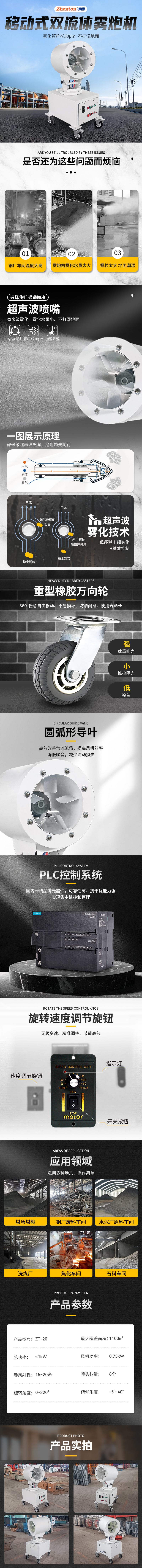 产品特点:郑通ZT-20型双流体雾炮机,采用移动式设计,灵活便携,喷雾效率高,超声波喷雾技术,雾化颗?!?0μm,均匀细腻不打湿地面,风机功率1kw,不加装水泵设计,占地面积小,方便安装。PLC控制系统,国内一线品牌元器件,可靠性高,抗干扰能力强,可实现集中监控和管理。0-320°旋转角度搭配可调节按钮,精准喷雾,节能降耗。20-70米射程,型号齐全,移动式、固定式、室内吊装都可定制生产,有需要欢迎随时联系徐经理:17303712093(微信同号)