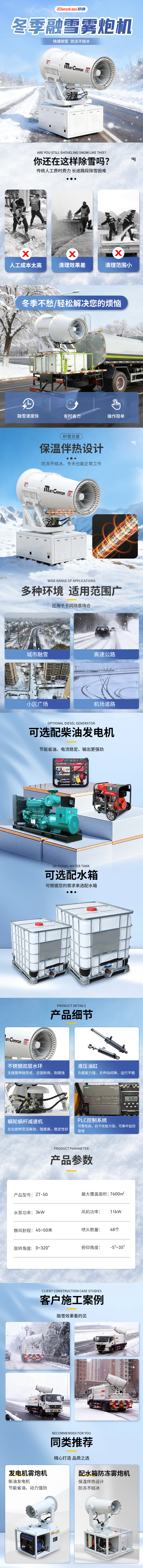 产品特点:ZT-50型车载式融雪/降尘雾炮机,是郑州郑通风机制造有限公司新型研发的除雪雾炮机,装配洒水车,可实现快速除雪,整体采用加厚材质,防冻不结冰,冬季零下温度也能正常使用,50米射程,最大覆盖面积可达7600㎡,可选配柴油发电机,节能省油,电流稳定,输出更强劲,也可根据您的需求来选配水箱,主要部件有不锈钢双层水环,液压油缸,无轮蜗杆减速机,PLC控制系统。配件可靠,运行更安全。有15-150米射程可选,有需要欢迎随时联系郑州郑通徐经理17303712093(微信同号)。